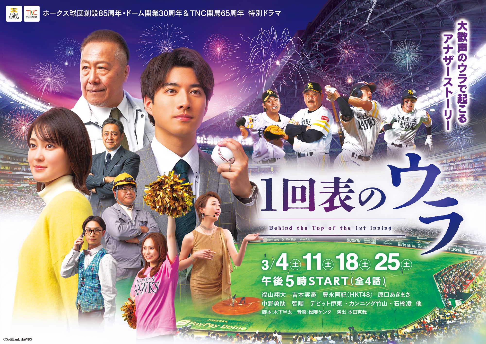 主人公は「戦力外通告」を受けた元プロ野球選手・関口(福山翔大)。関口は球団職員として、2023年のホークスの開幕戦セレモニーを任されることになった。元選手としてのプライドが捨てきれない中、清美(吉本実憂)らと準備を進めるが、突然、助っ人外国人が行方不明になったり、ハニーズが内部分裂しそうになったり…次々と難題が降りかかる。