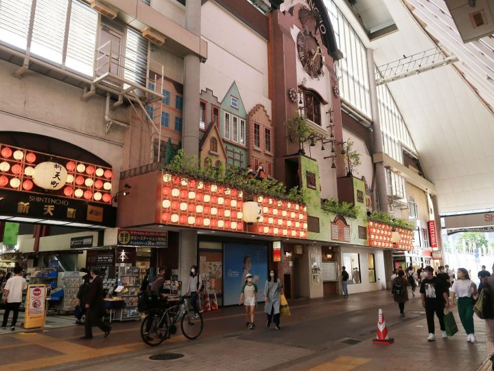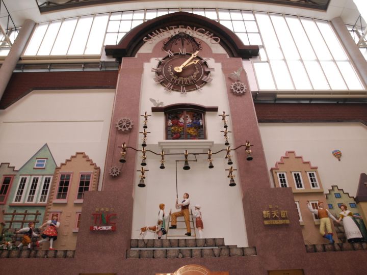 新天町商店街は、福岡市の中心・天神に位置する、およそ90の店舗が集まった商店街で、東西に延びる北通り・南通りのアーケードと、からくり時計があるメルヘン広場で構成されています。広場は屋根に覆われており、雨天でも差し支えはありません。時計は毎日定時にチャイムが1分間曲を奏で、扉が開いてピエロが音楽に合わせて踊ります。